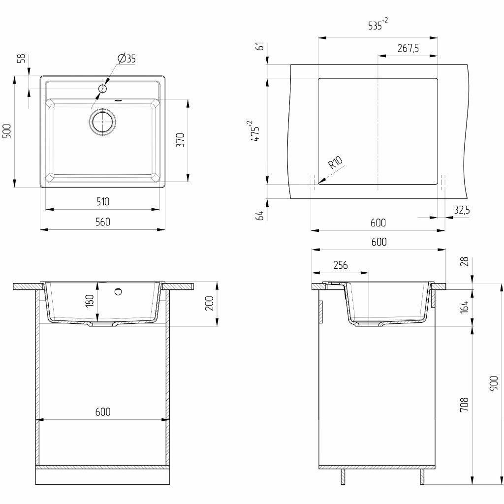 Мойка для кухни врезная каменная под столешницу квадратная черная Ulgran U-104-308 560х500х200 мм искусственный мрамор