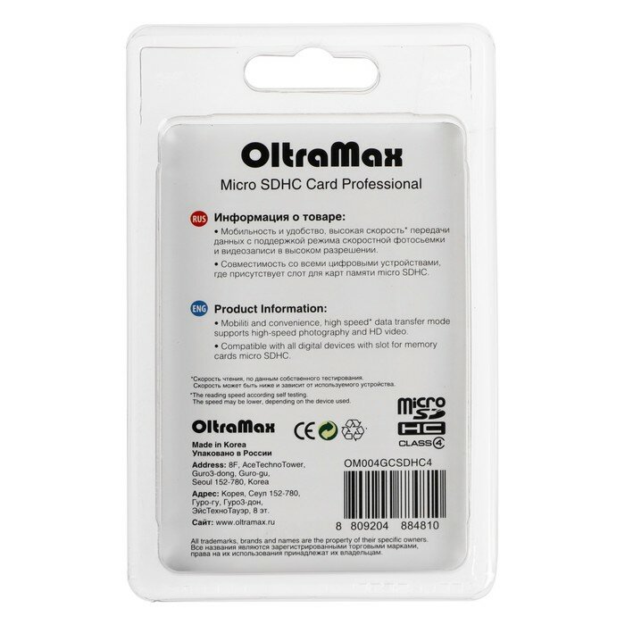 Купить Карта памяти OltraMax MicroSD, 4 Гб, SDHC, класс 4, с адаптером SD