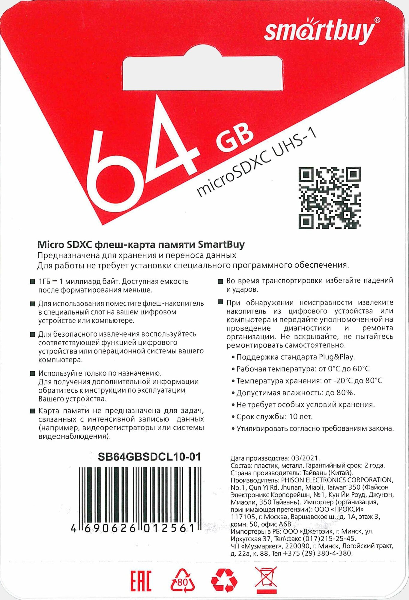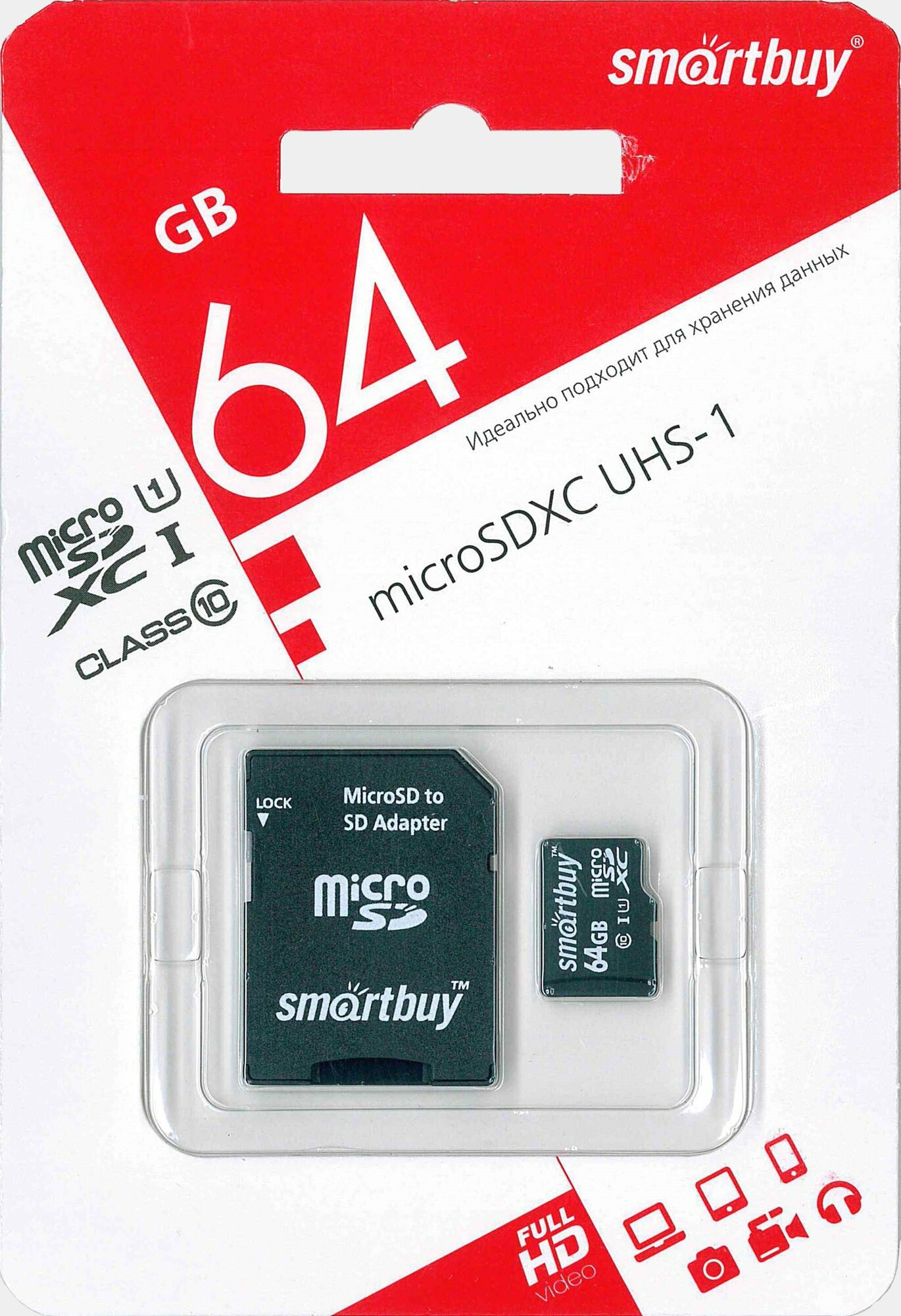 Купить Карта памяти 64Gb - SmartBuy Micro Secure Digital HC Class 10 SB64GBSDCL10-01 с переходником под SD (Оригинальная!)