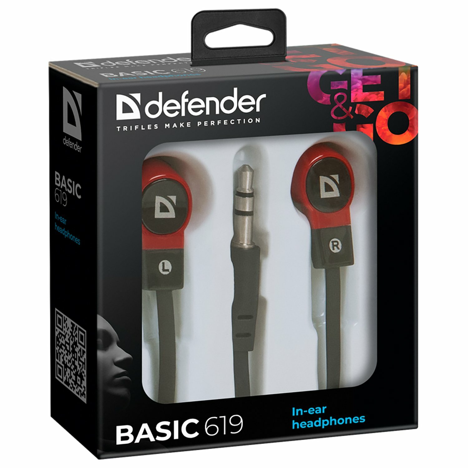 Проводные наушники внутриканальные Defender Basic-619 Jack 3.5 из пластика, цвет черно-красный, 1 шт