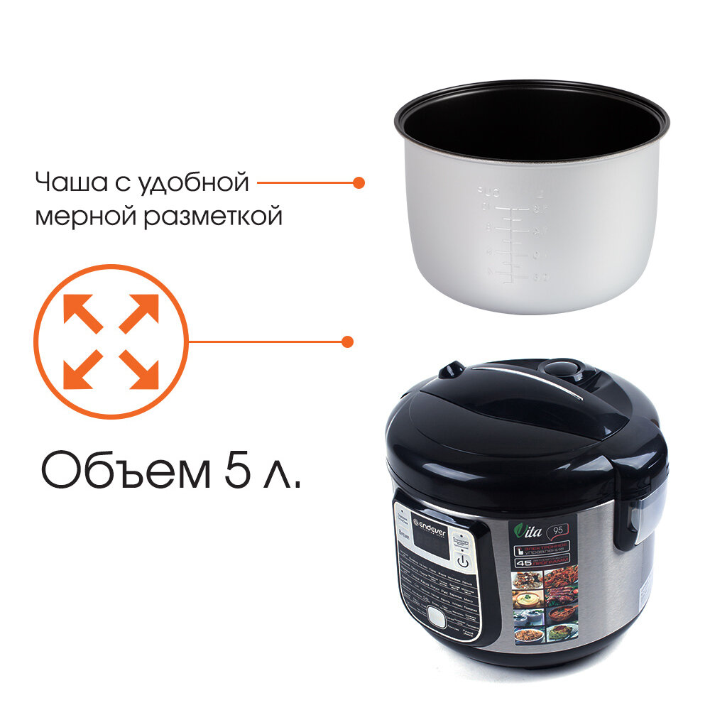 Мультиварка Endever Vita 95, мощностью 1000 Вт, с антипригарной чашей 5л, 45 авторежимов работы