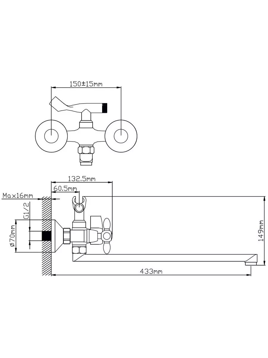 POTATO Смеситель для ванны (Zn) плоский повор.излив 40см, кран-буксы1/2,двухвен,хром/черный,P2771-6