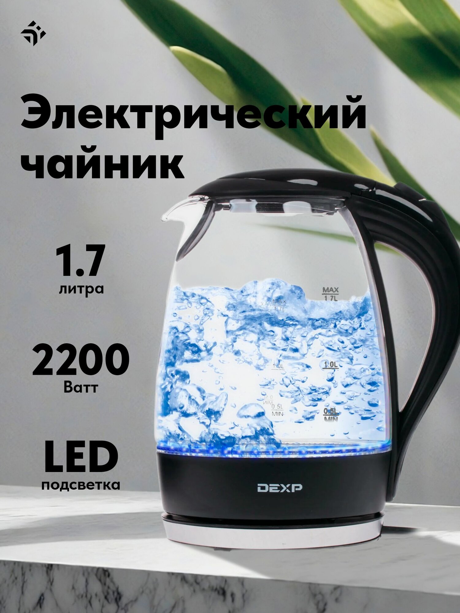 Электрочайник DEXP GF-175 Wave черный [пластик, термостойкое стекло, 1.7 л, 2200 Вт, фильтр, дисковый нагреватель]