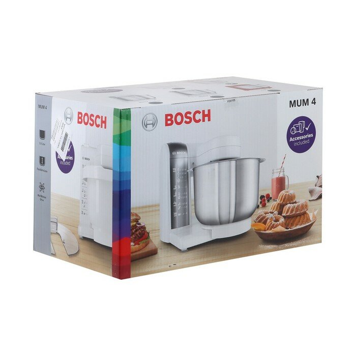 Кухонная машина Bosch MUM4407, 500 Вт, 3.9 л, 4 скорости, 3 насадки, бело-серая