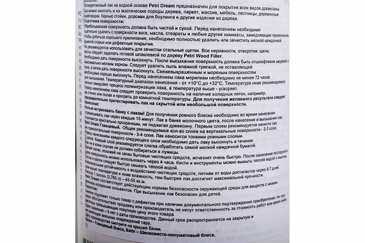 Лак Petri Dream акриловый полиуретановый на водной основе глянцевый 3,785л