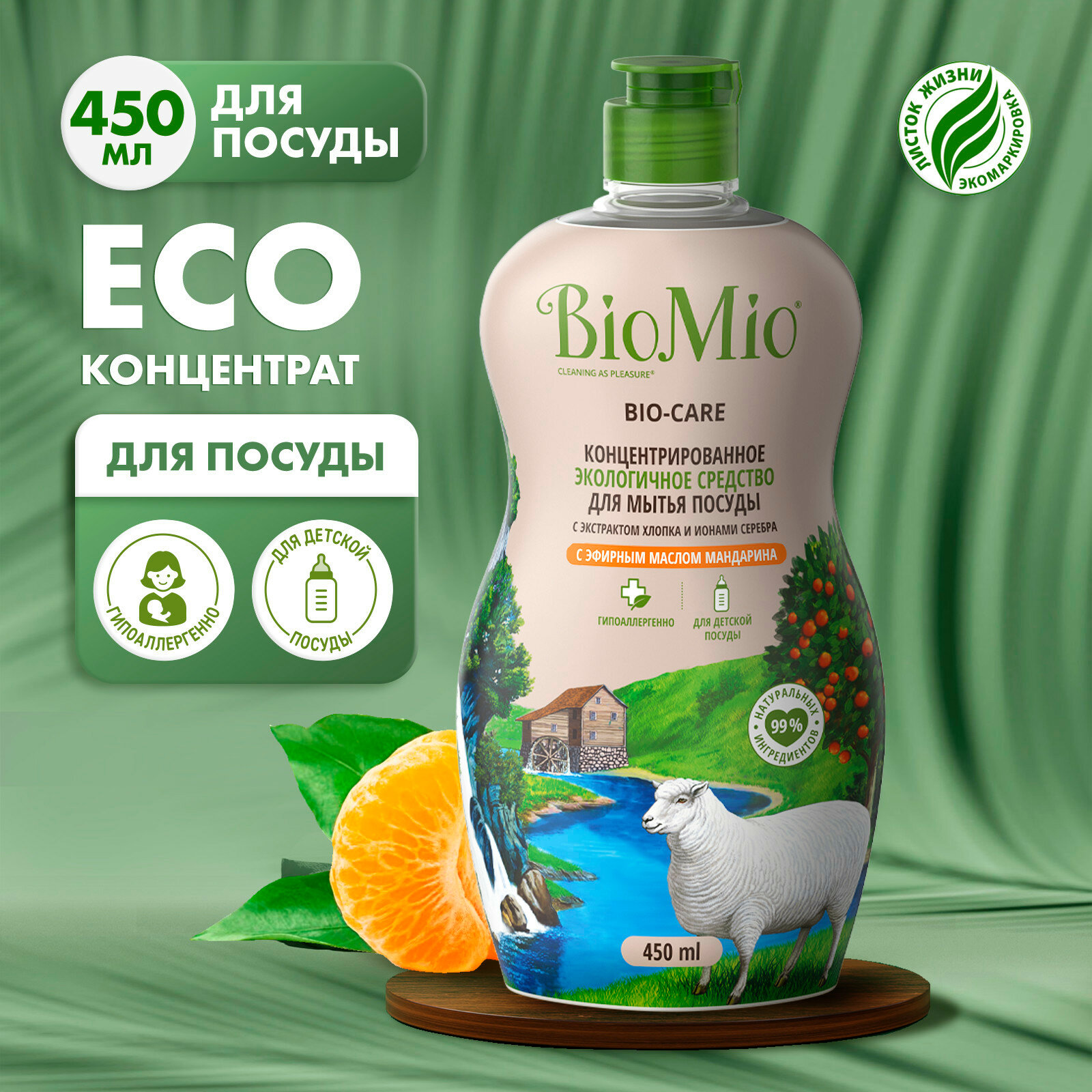 Экологичное средство для мытья посуды, в том числе детской, и продуктов BioMio, с эфирным маслом мандарина, концентрат, 450 мл (2 шт)