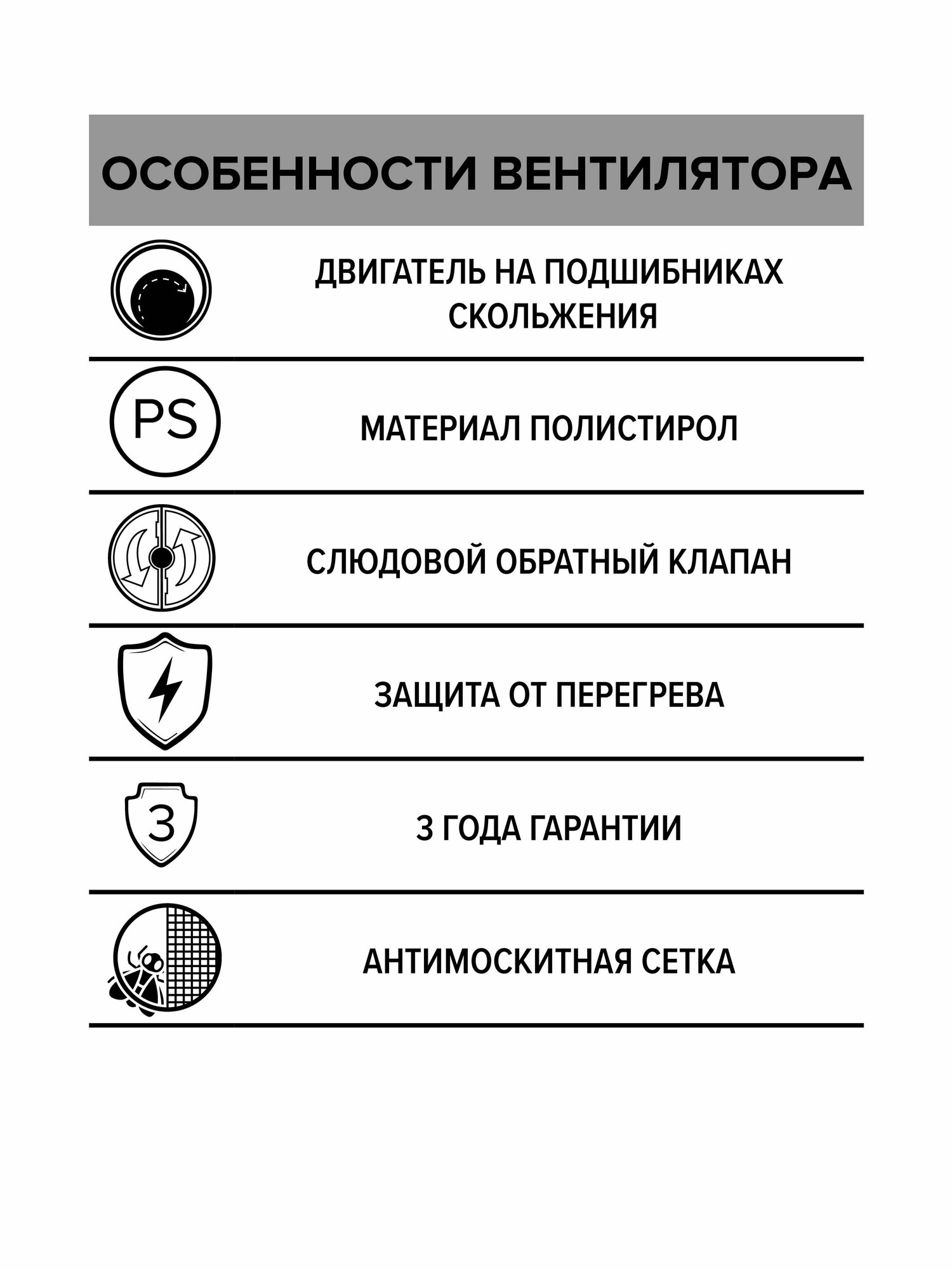 | Плюсы: | Очень удобный размер, т. к. Вентилятор полностью закрывает отверстие вентиляции. Хороший обратный клапан. Удобно устанавливать. |