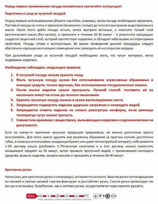 Ручка для сковороды снабжена максимально неудобным креплением Куча закорочек при эксплуатации, закинуть в раковину с водой чтобы откисала нельзя, оставить мокрой нельзя. После каждого использования нужно просушить и протереть маслом чтобы не было ржавчины. |