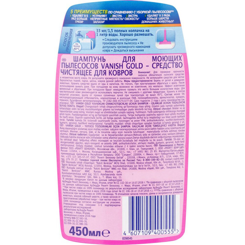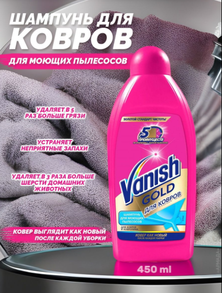 Средство для чистки ковров 450 мл VANISH (Ваниш) GOLD, для моющих пылесосов, 3038214 (арт. 607512)