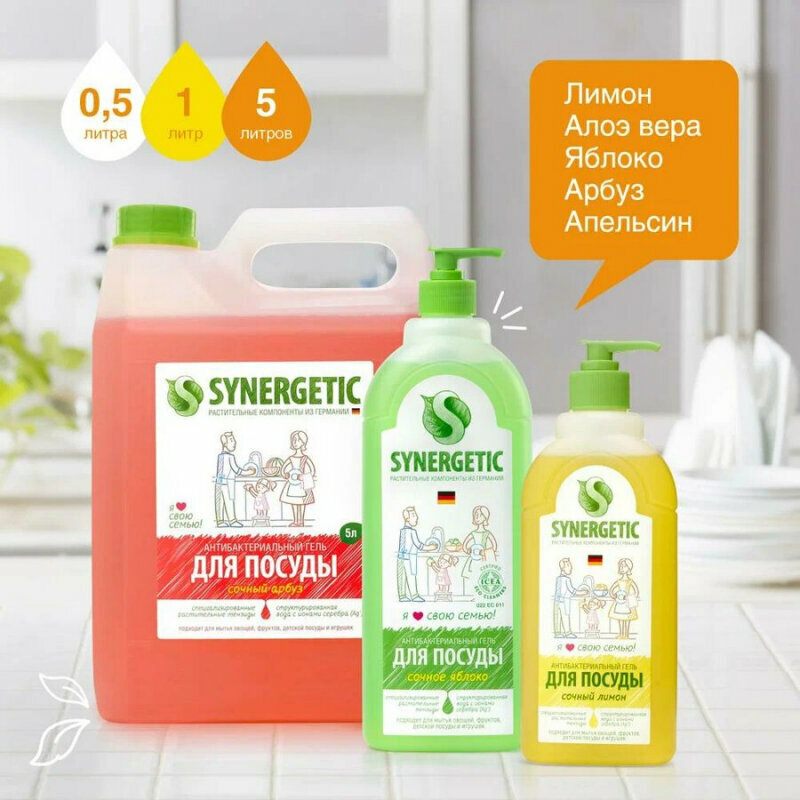 Synergetic Жидкое средство для мытья посуды, фруктов и детских принадлежностей (антибактериальный биоразлагаемый гель) сочное яблоко, флакон 1л