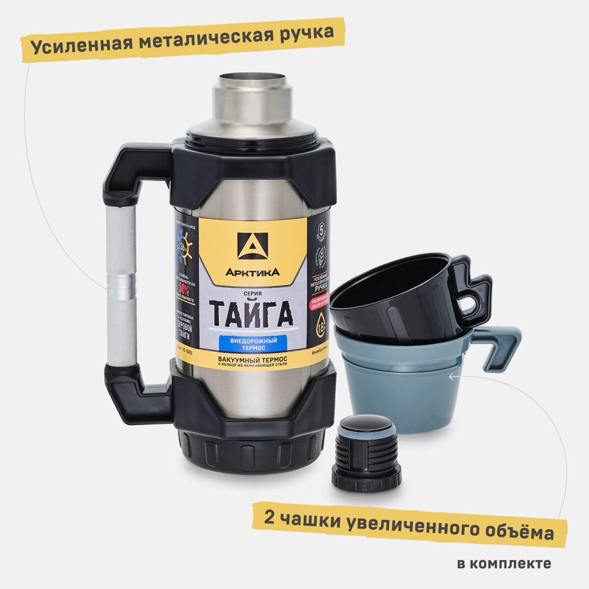 Термос для чая 1,5 л Арктика Тайга 1500 мл усиленный корпус с ручкой, 2 чашки в комплекте для рыбака, для туриста, для охотника