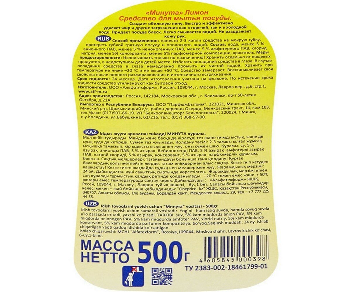 Купить Альфатехформ Моющее средство для посуды Минута Лимон 500 мл
