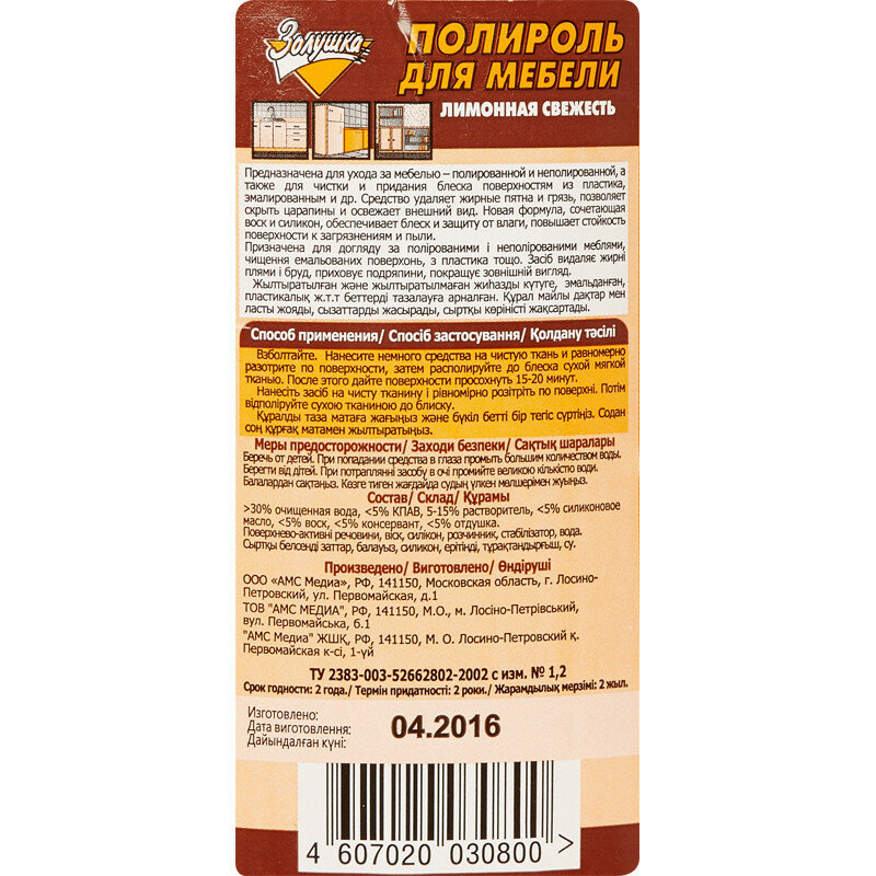 Ниже Вы можете прочитать отзывы на Средство для мебели Золушка, Полироль, лимонная свежесть, 250 мл, ознакомится с подробными характеристиками, посмотреть интересные обзоры и фотографии на Средство для мебели Золушка, Полироль, лимонная свежесть, 250 мл.