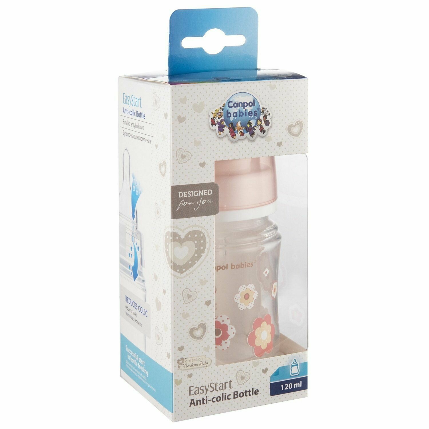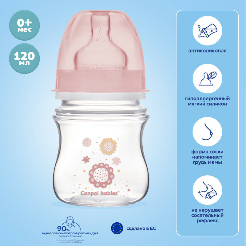 Canpol Babies Бутылочка антиколиковая с широким горлом EasyStart Newborn Baby 120 мл, с рождения, розовые цветы