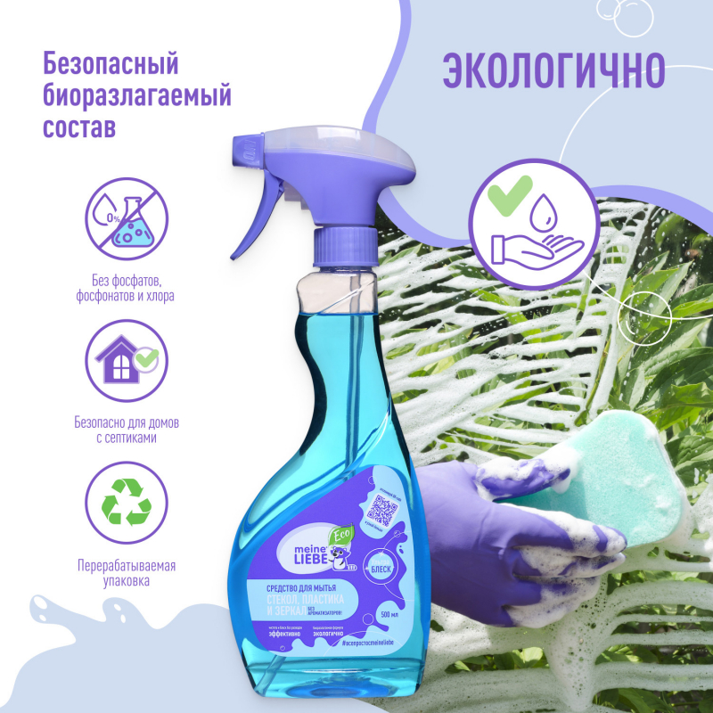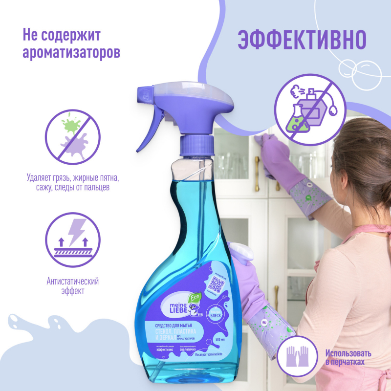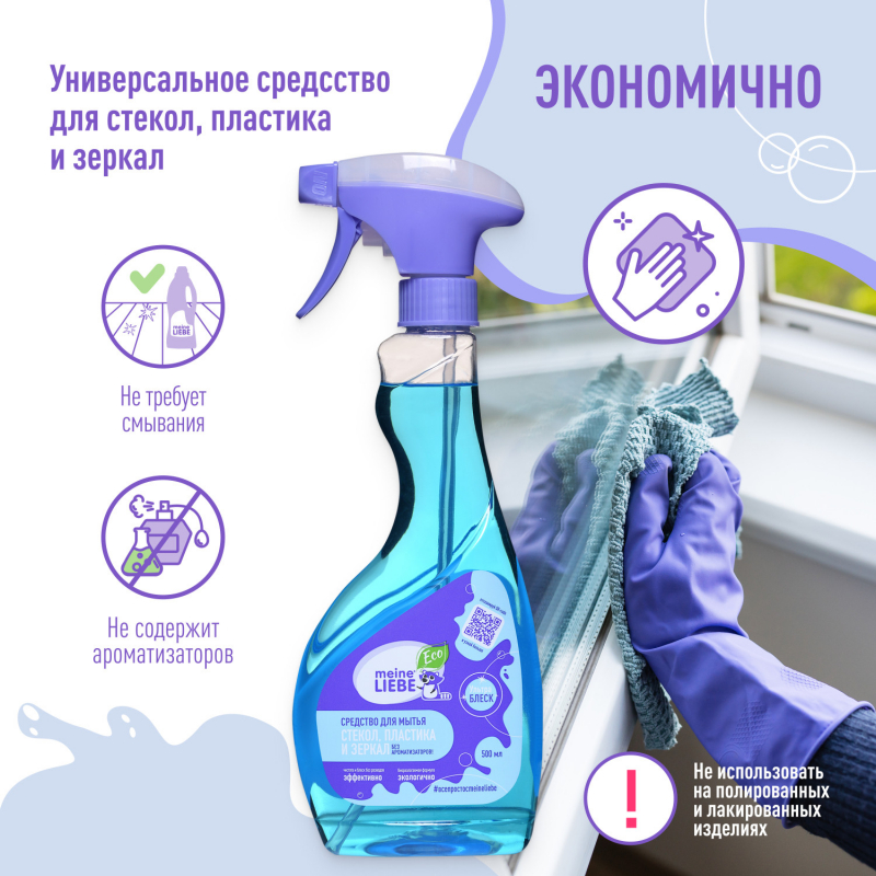 Хорошее средство для стёкол, зеркал, пластика. Бережно очищает стеклянные и зеркальные поверхности, не оставляет разводов. Во время распыления средства есть терпимый запах (не химозный) быстро выветривается. Я использовала без перчаток, руки не пострадали, кожа не сухая. Расход средства небольшой, самое главное- безопасный состав, если в доме маленькие детки или животные - можно не переживать. Думаю за это многие мамочки и любят линейку средств Meine Liebe