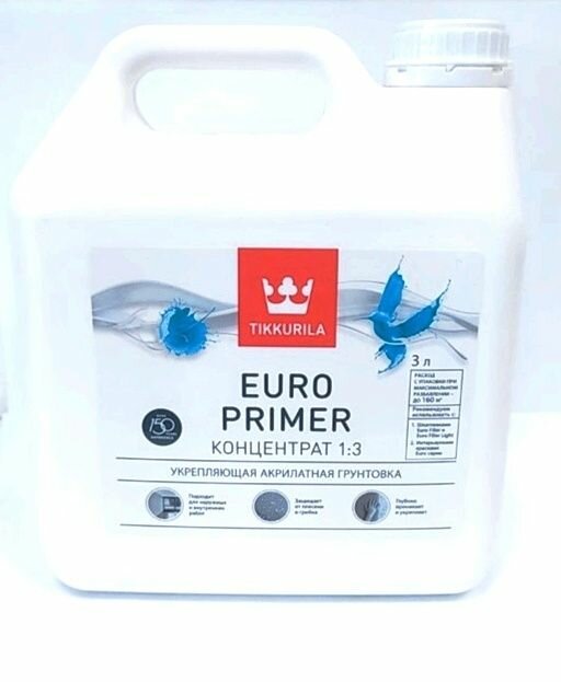 Ниже Вы можете прочитать отзывы на Грунтовка акриловая Tikkurila Euro Primer (Евро Праймер) 3 л, ознакомится с подробными характеристиками, посмотреть интересные обзоры и фотографии на Грунтовка акриловая Tikkurila Euro Primer (Евро Праймер) 3 л.