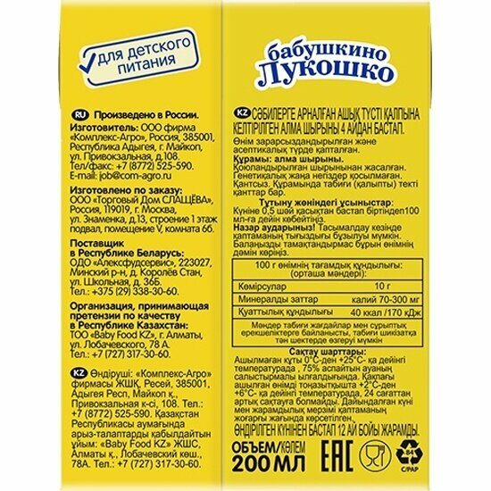 спайка Сок Бабушкино Лукошко яблочный осветленный , 0,2 л, 18 шт интересное: