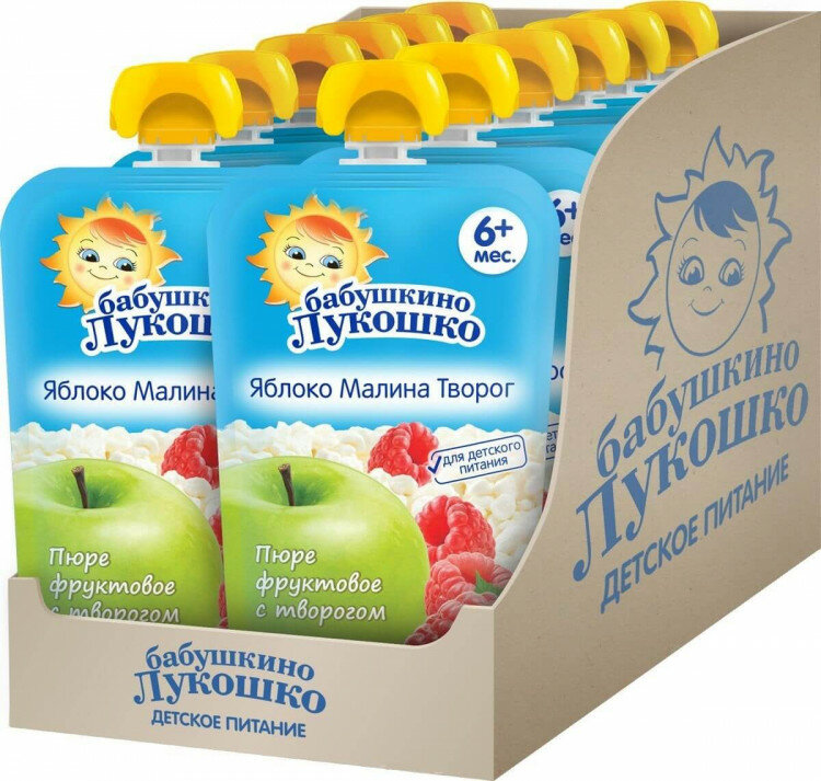 Пюре Бабушкино Лукошко Яблоко и Малина с Творогом с 6 мес 90 г (пауч) (12 штук в упаковке)