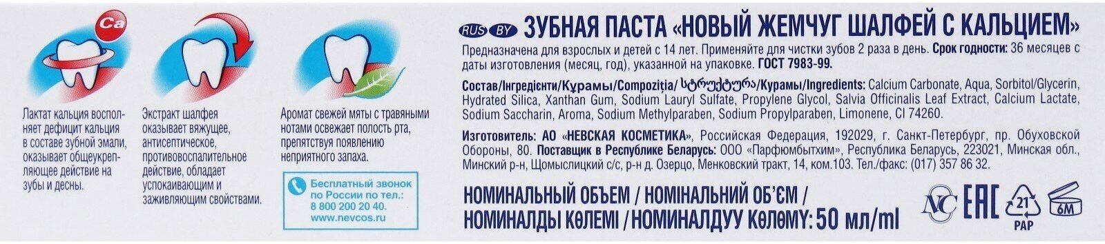 Невская косметика Зубная паста Новый Жемчуг Шалфей с кальцием 50 мл