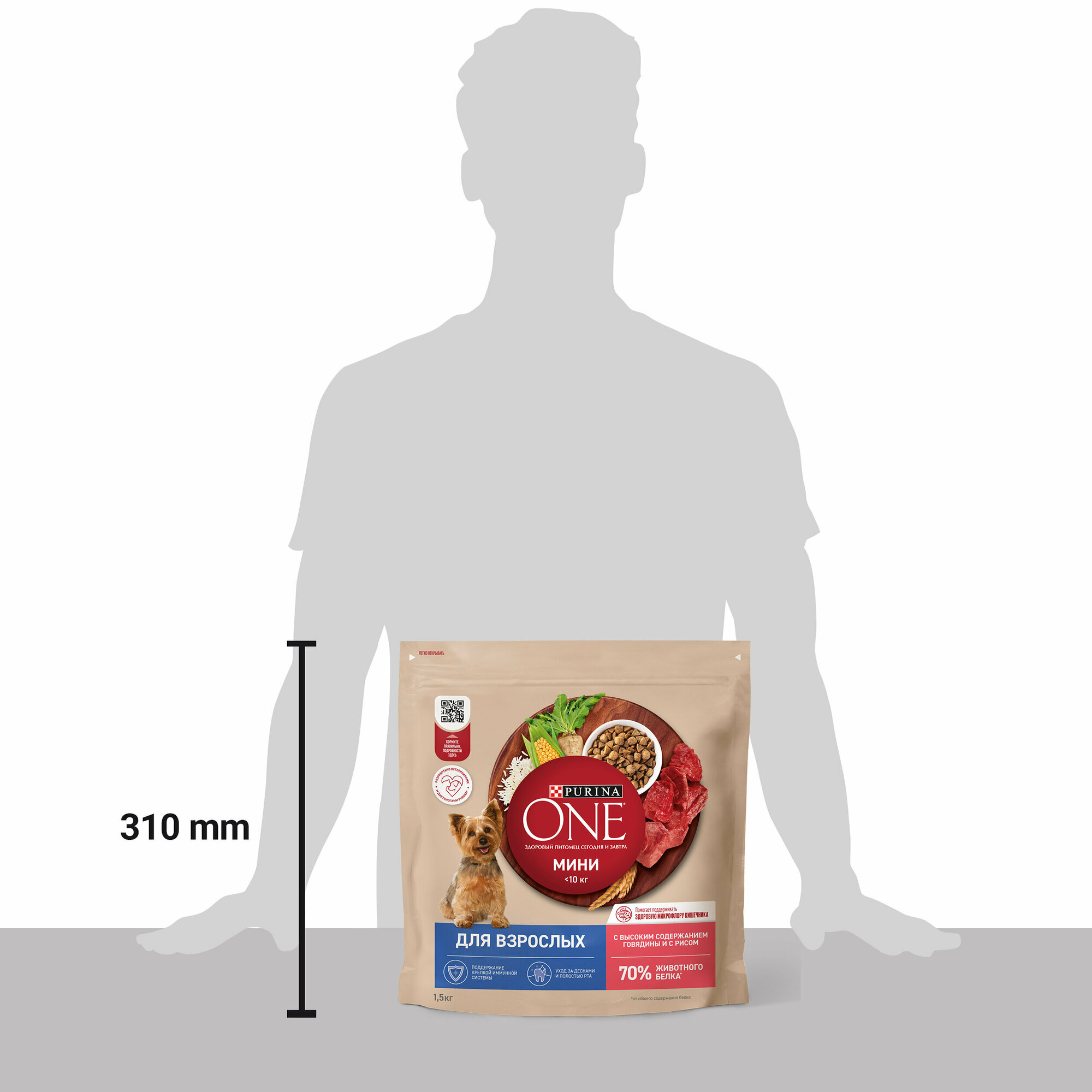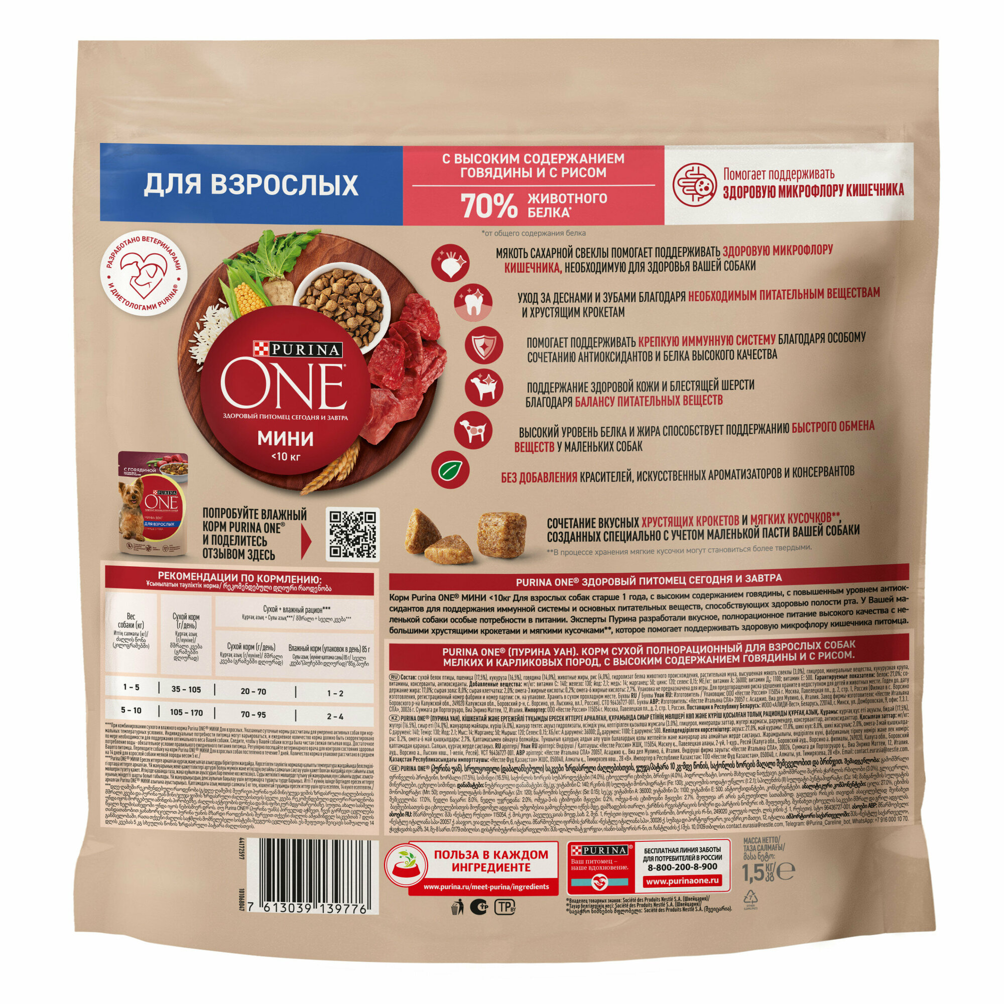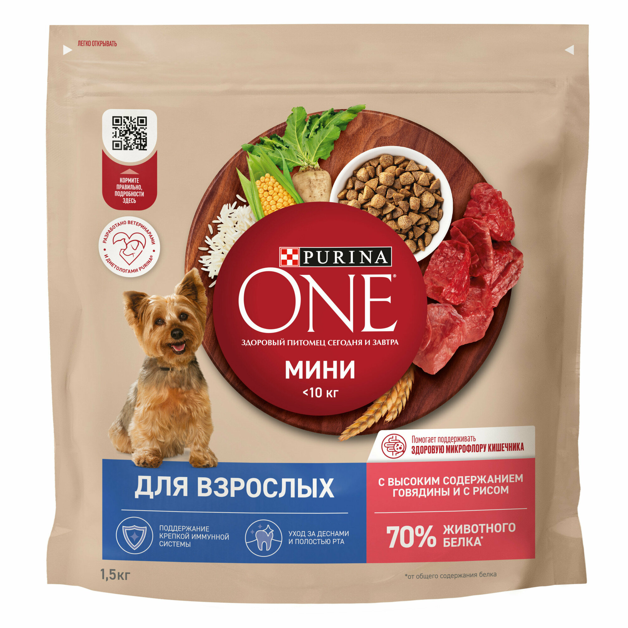 Сухой корм Purina ONE мини <10 кг для взрослых собак мелких и карликовых пород, с говядиной и с рисом, 1,5 кг