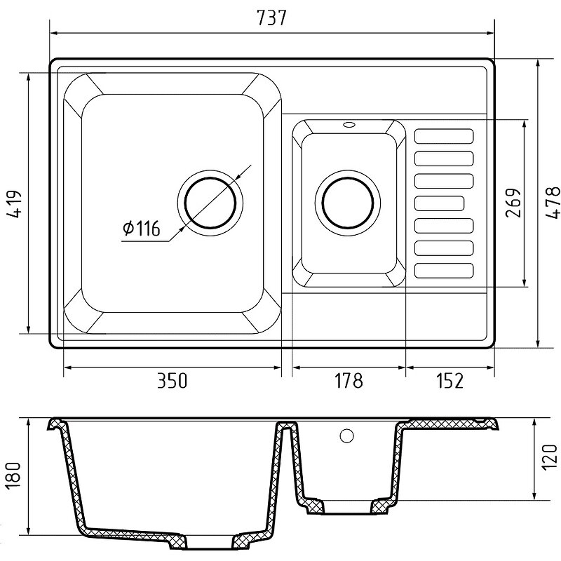 | Плюсы: | Вместительная мойка с двумя отделениями, очень удобно |