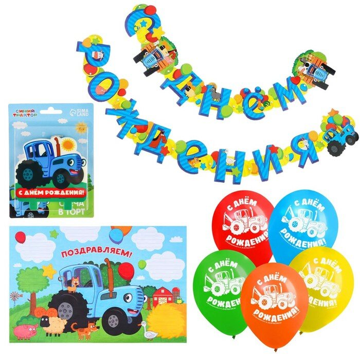 Купить Набор для праздник. Гирлянда, плакат, свеча, шарики 5 шт "Синий трактор"