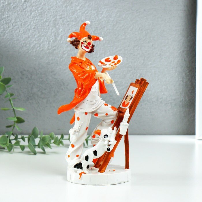 Сувенир полистоун "Клоун-художник у мольберта с пёсиком" бело-оранжевый 12,5х9х22,5 см, "Hidde", цвет белый интересное: