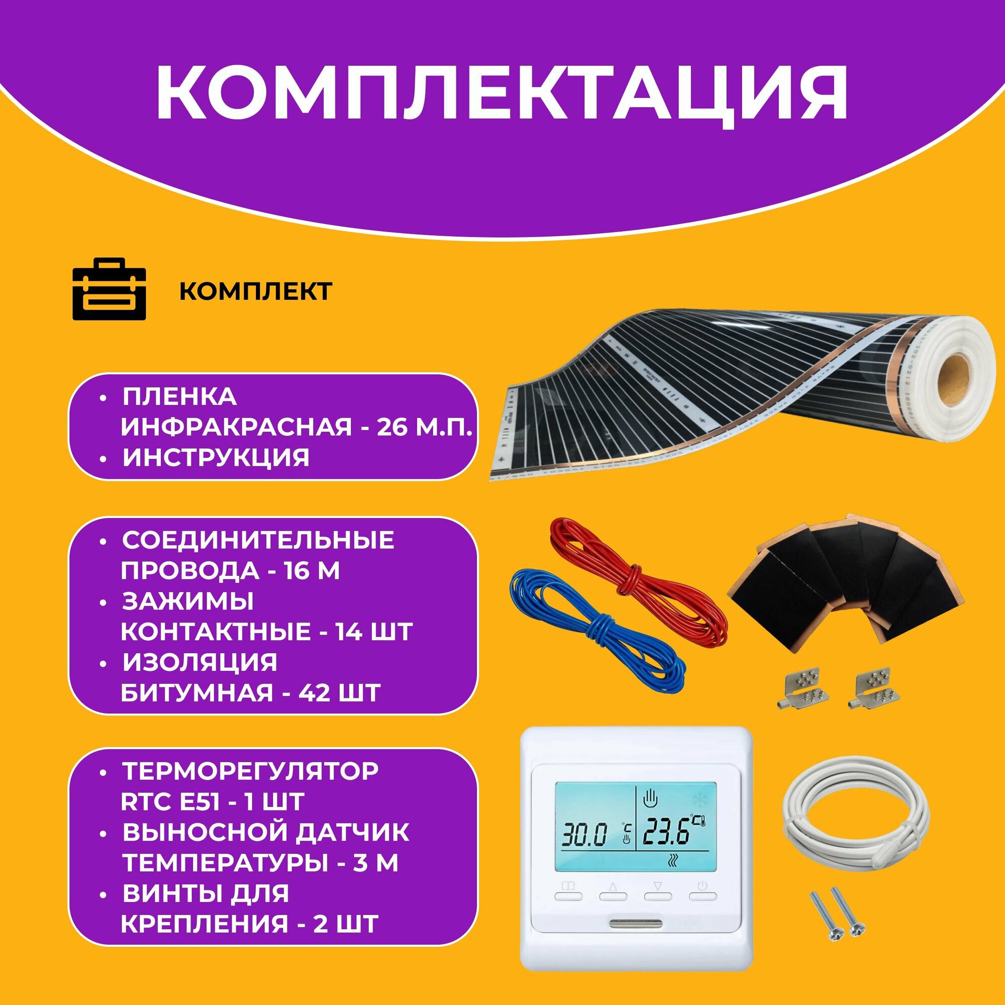 Теплый пол инфракрасный, электрический, пленочный под ламинат / линолеум / ковролин. Комплект с терморегулятором 13 м.кв. Инфракрасная пленка ширина 50см, 13 м2. интересное: