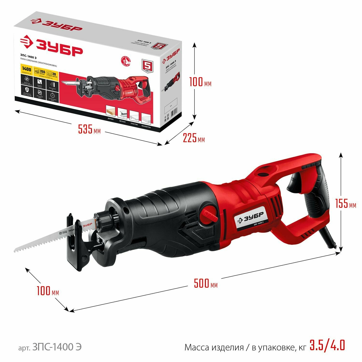 Пила сабельная ЗУБР ЗПС-1400 Э, 1400 Вт, 255 мм (дерево), 20 мм (сталь), ход штока 32 мм,