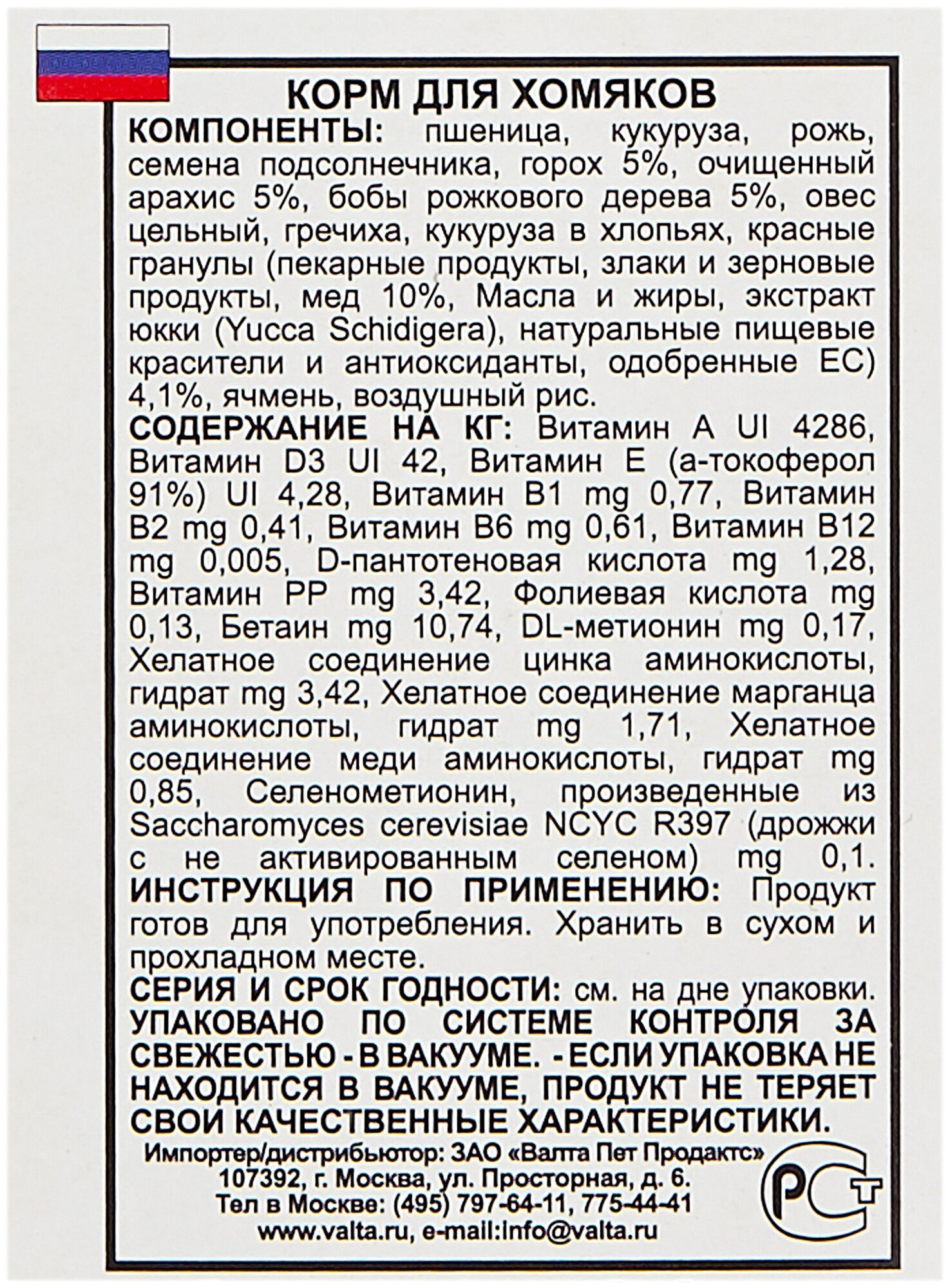 | Минусы: | Цельные зерна кукурузы, которые хомяки не грызут. Лучше бы вместо них было больше плющеной кукурузы. |