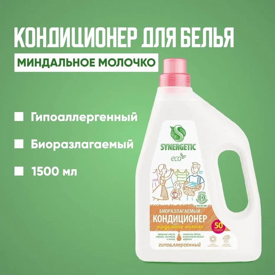 Кондиционер-ополаскиватель для белья Synergetic Миндальное молочко, гипоаллергенный, 1.5 л
