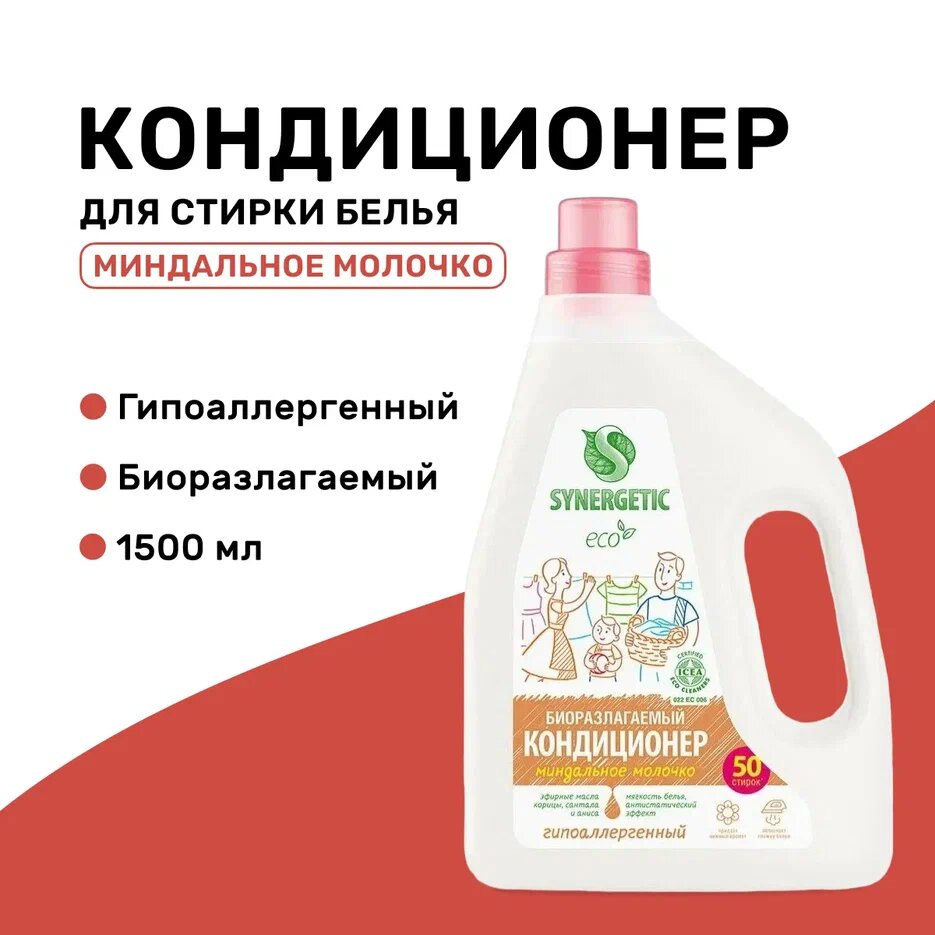 Кондиционер для белья SYNERGETIC 1500мл кондиционер-ополаскиватель для белья Миндальное молочко