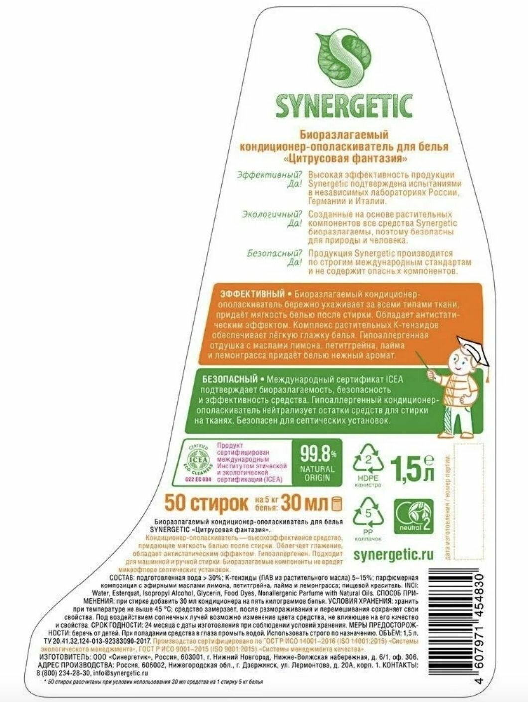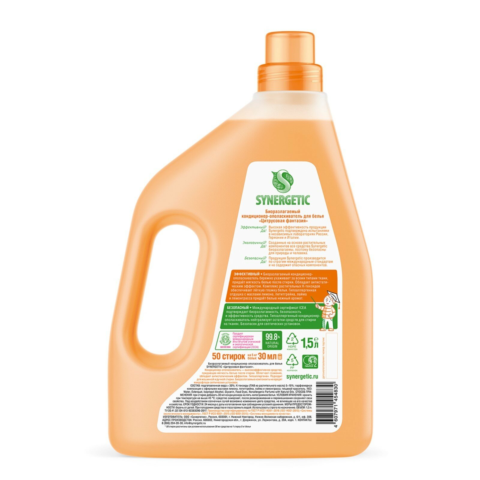 Купить Кондиционер-ополаскиватель для белья SYNERGETIC "Цитрусовая фантазия" гипоаллергенный, 1,5л, 50 стирок