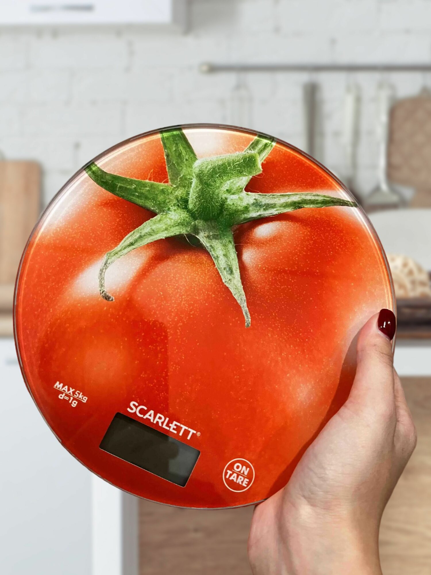 Весы кухонные SCARLETT SC-KS57P38 "Помидор", электронный дисплей, max вес 5 кг, тарокомпенсация, стекло