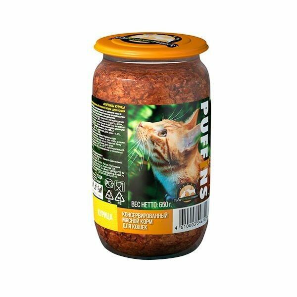 Консервы Puffins 650г для кошек Курица стекло (Упаковка 8 шт)