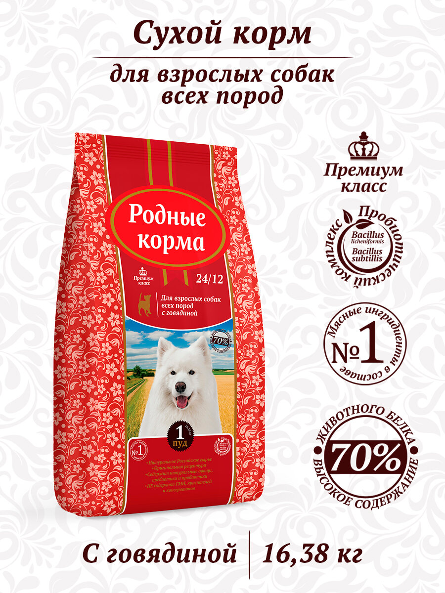 Родные корма сухой корм для взрослых собак с говядиной 22/10 1 пуд 16,38 кг