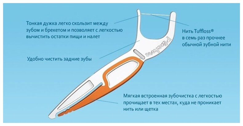 | Минусы: | Длина нити небольшая и для больших зубов могут быть проблемы в использовании.