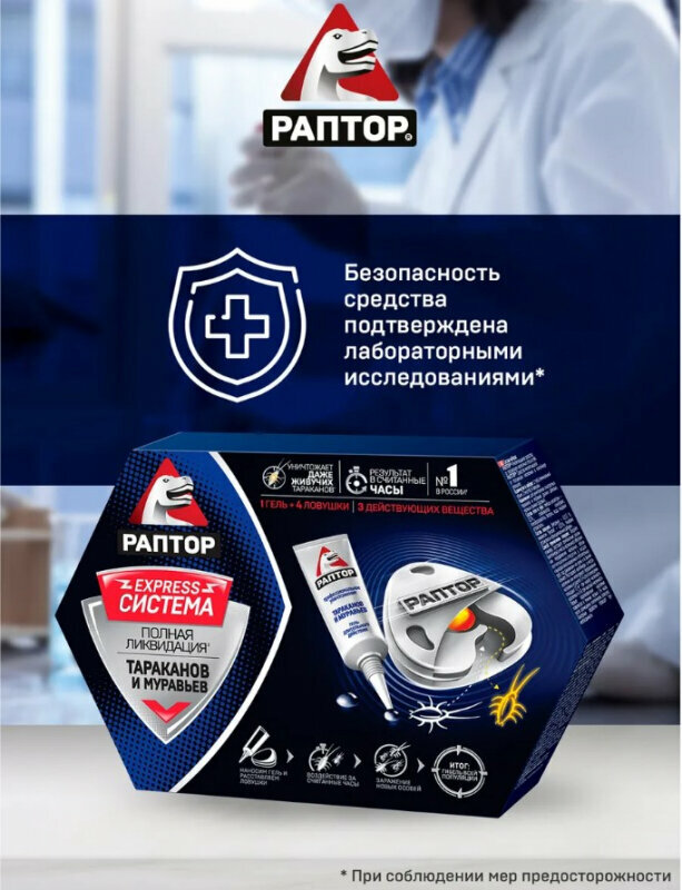 Средство от насекомых: тараканов и муравьев, Система ликвидации, Раптор: 4 клеевые ловушки + гель , 1 шт