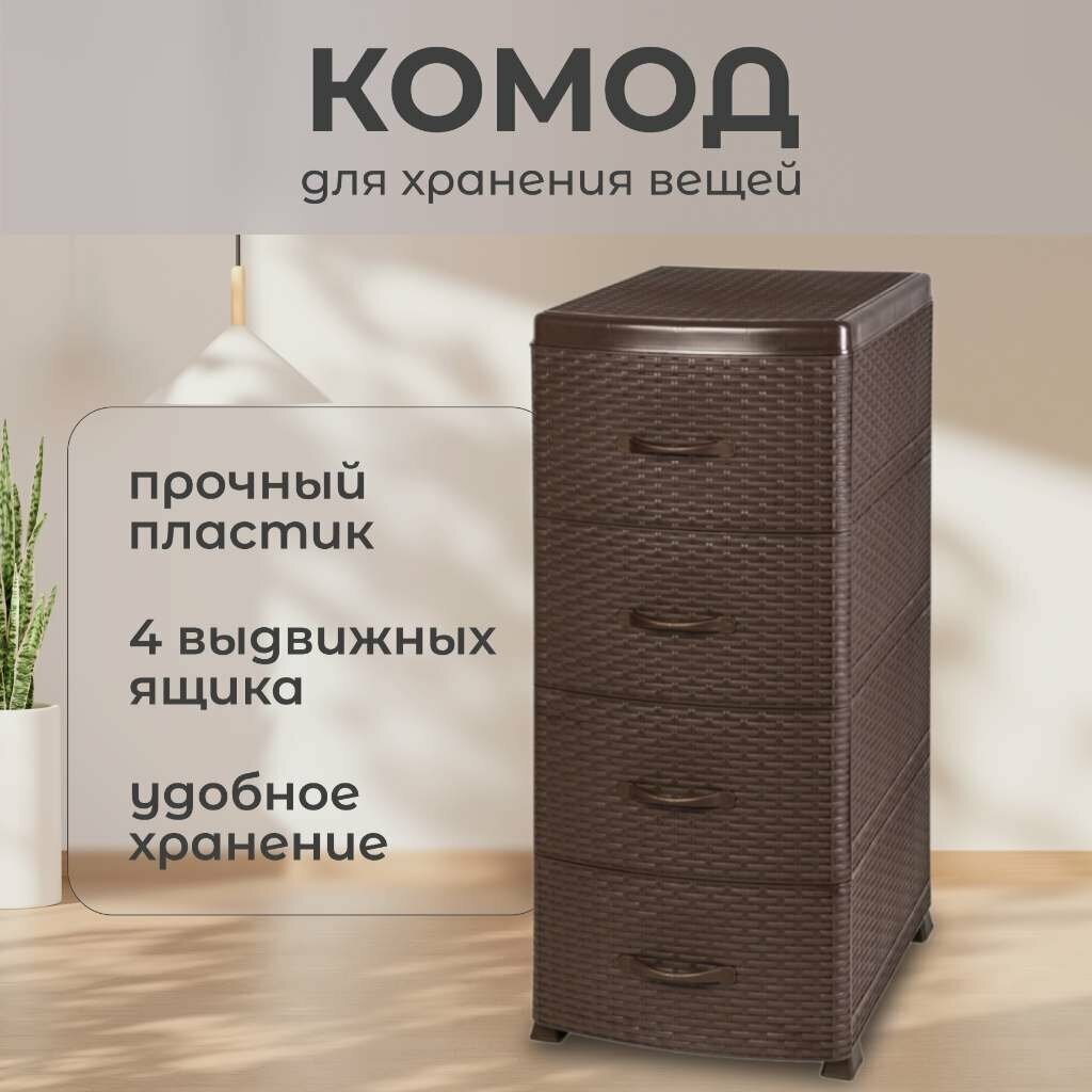 Комод пластиковый Ротанг с 4 ящиками / универсальный стеллаж для хранения вещей / органайзер для аксессуаров, цвет коричневый