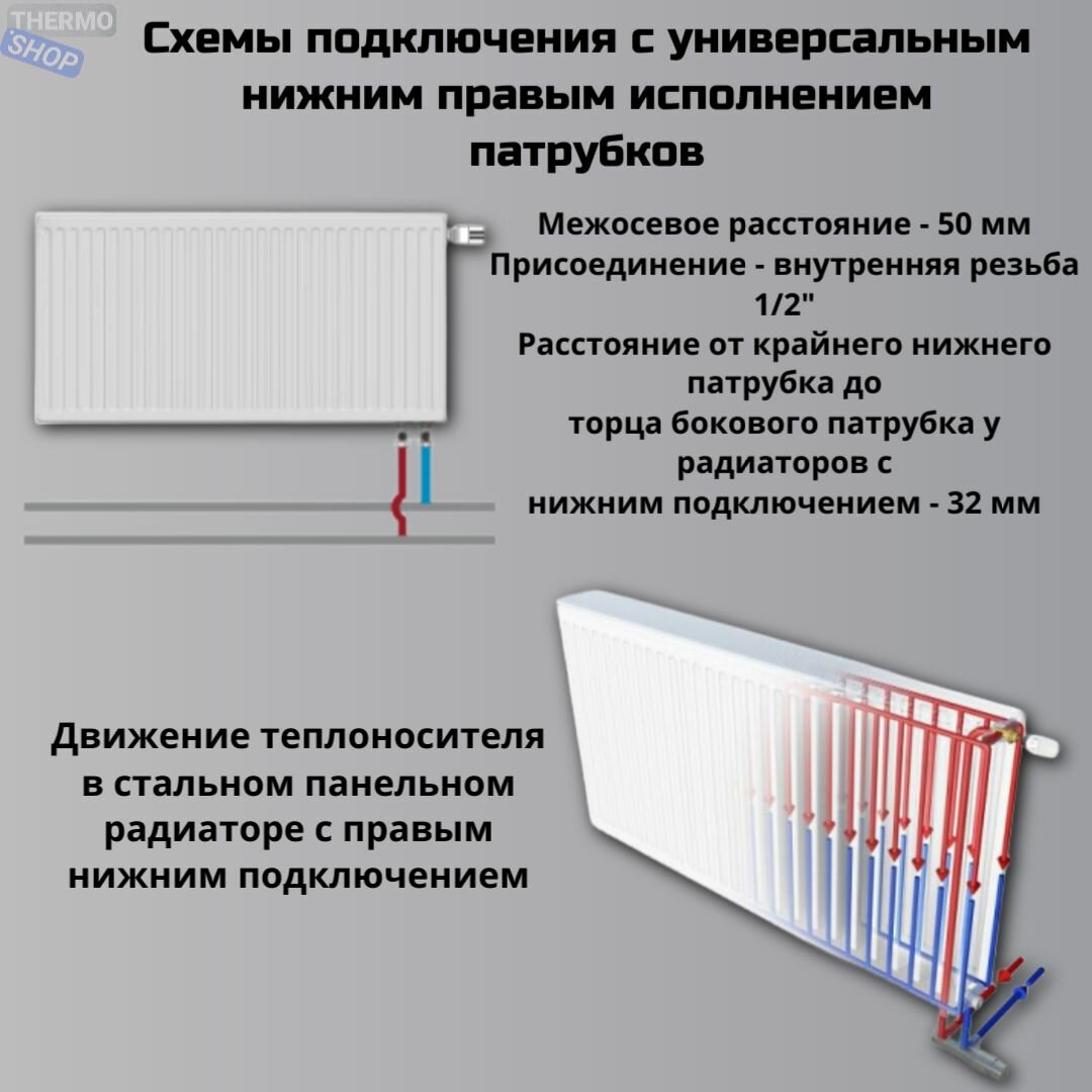 Радиатор стальной панельный ROMMER 500х1000 нижнее правое подключение Ventil 11/500/1000 Нить сантехническая