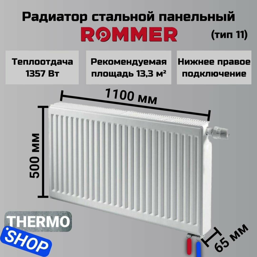 Радиатор стальной панельный ROMMER Ventil 11/500/1100 нижнее правое подключение (RRS-2020-115110)