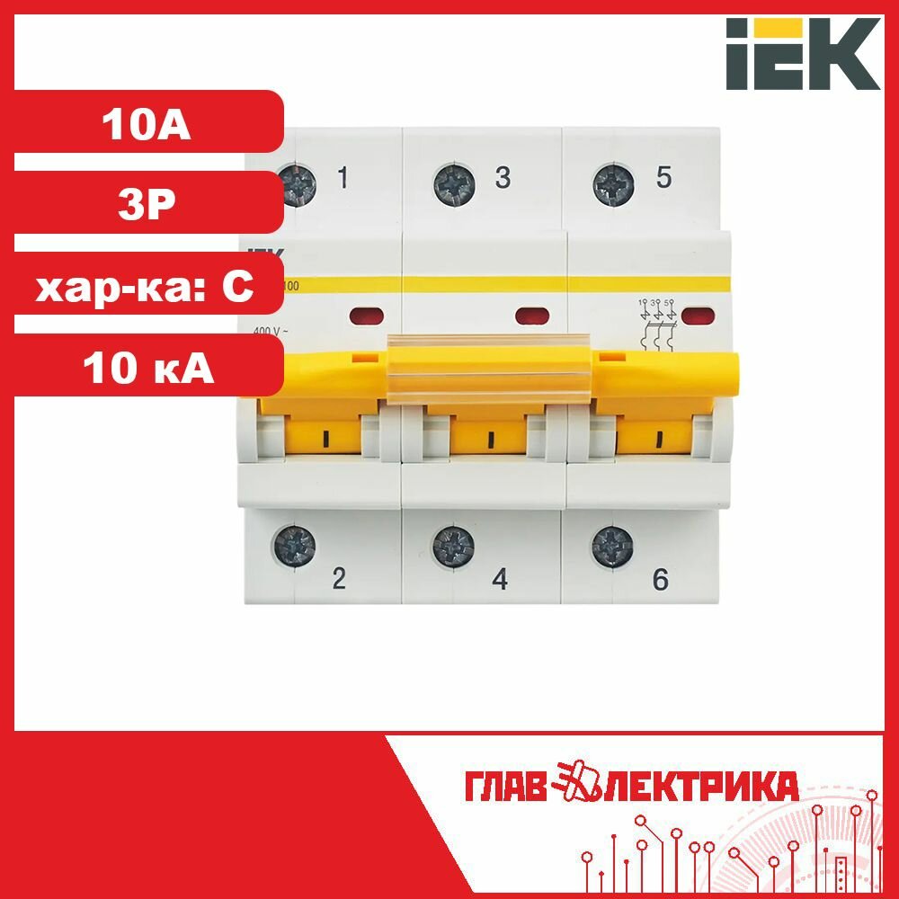 2шт. - Выключатель автоматический трехполюсный 10А С ВА47-100 10кА / IEK; арт. MVA40-3-010-C; оригинал / - комплект 2шт