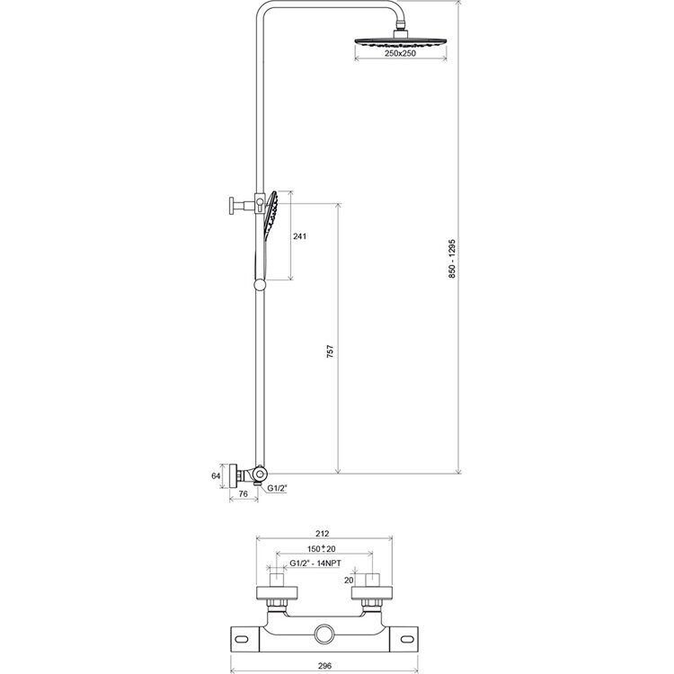 | Дополнительная информация | высота стойки для душа: 1295 мм; длина верхнего душа: 250 мм; ширина верхнего душа: 250 мм |