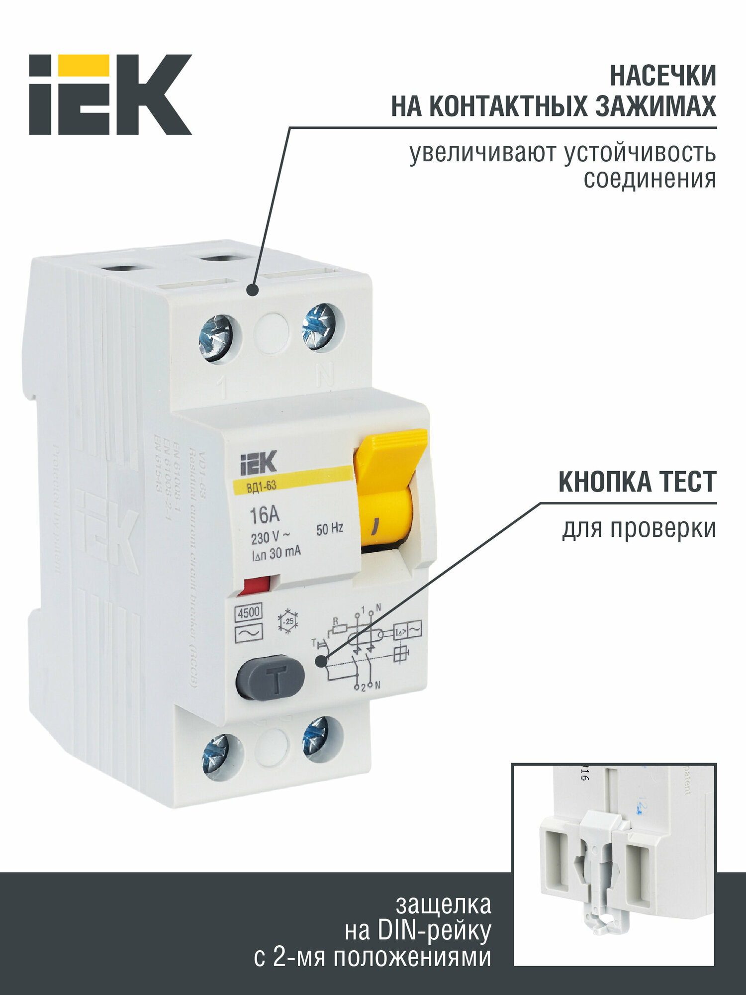 УЗО рейка DIN iEK ВД1-63 2п 16А 30мА 230В