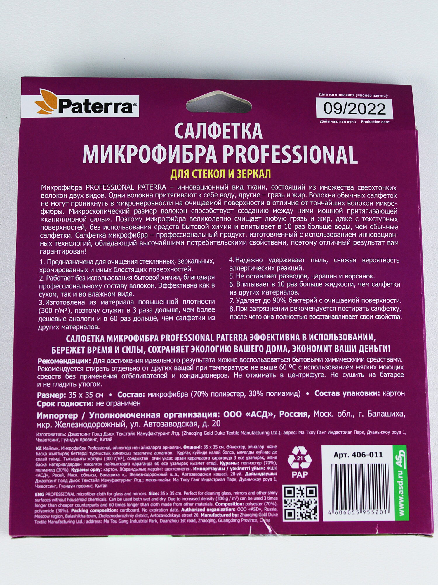 Салфетка микрофибра PROFESSIONAL, для стекол и зеркал, 35 * 35 см, в картонной упаковке, PATERRA (406-011)