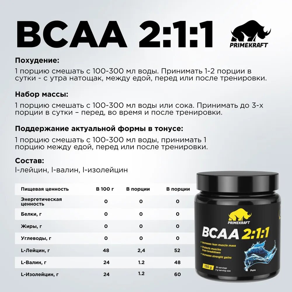 Аминокислоты PRIMEKRAFT BCAA 2:1:1 (БЦАА) Чистый (Без вкуса), 150 г / 30 servings