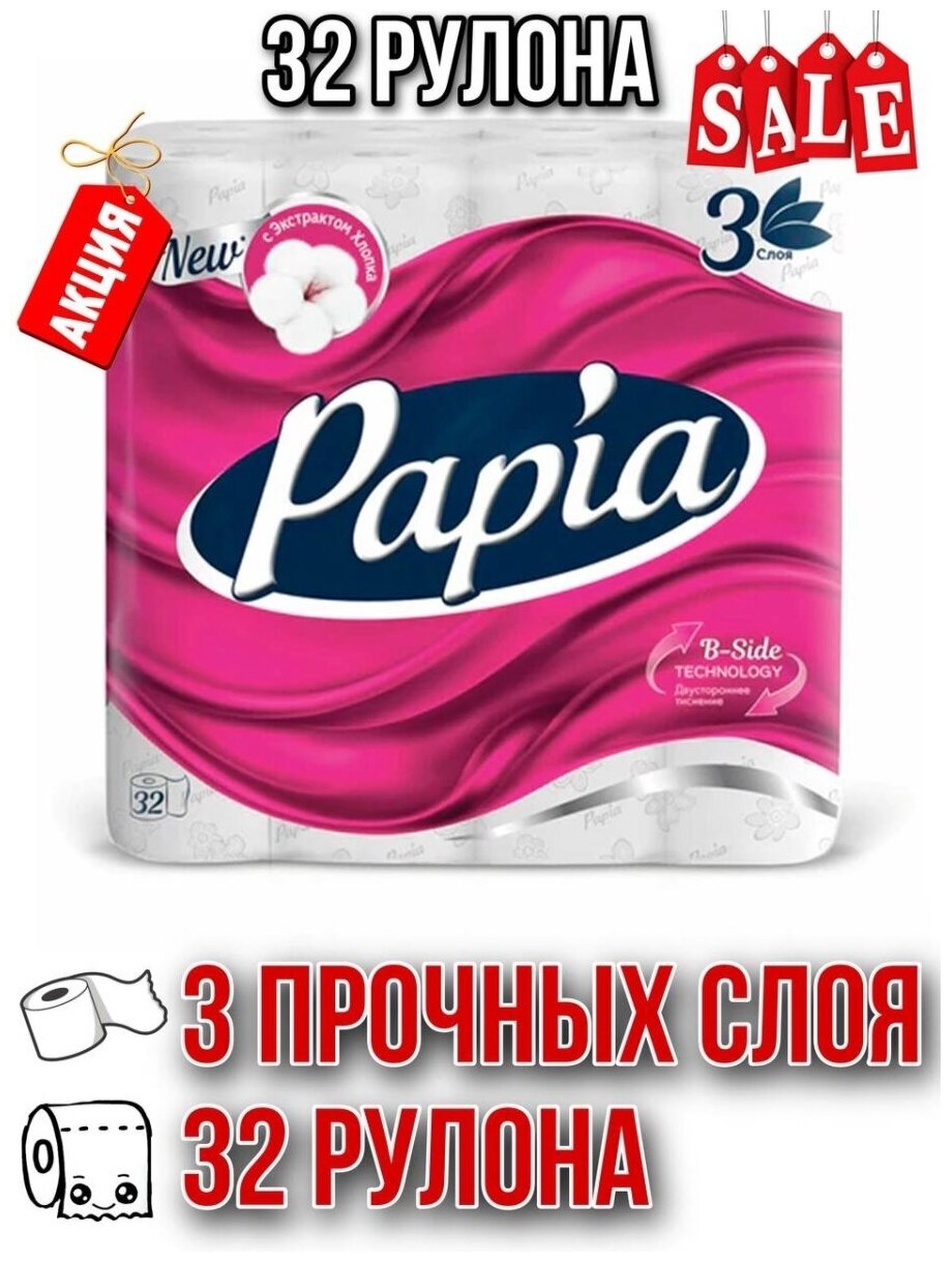 Papia Туалетная бумага 3-х слойная Белая, 32 рул в уп