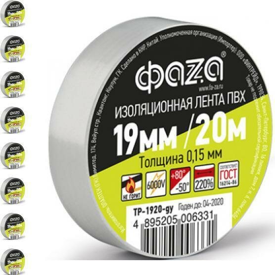 Купить Изолента ПВХ фаза 19 мм 20 метров серая (комплект из 8 шт)