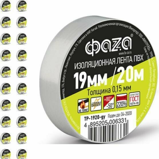 Купить Изолента ПВХ фаза 19 мм 20 метров серая (комплект из 20 шт)