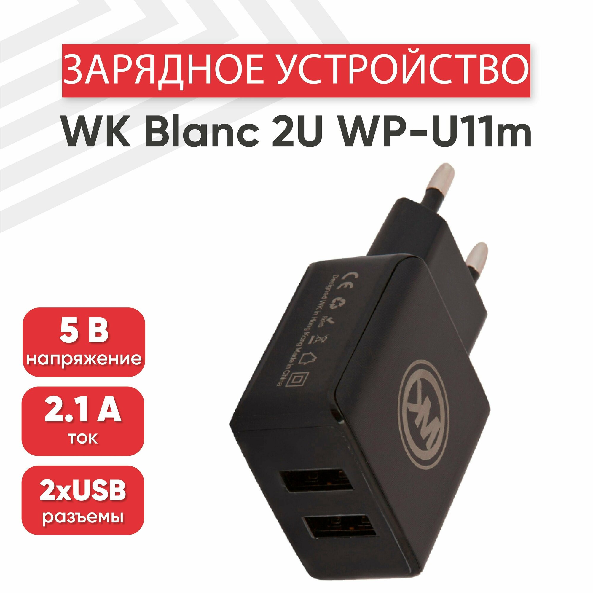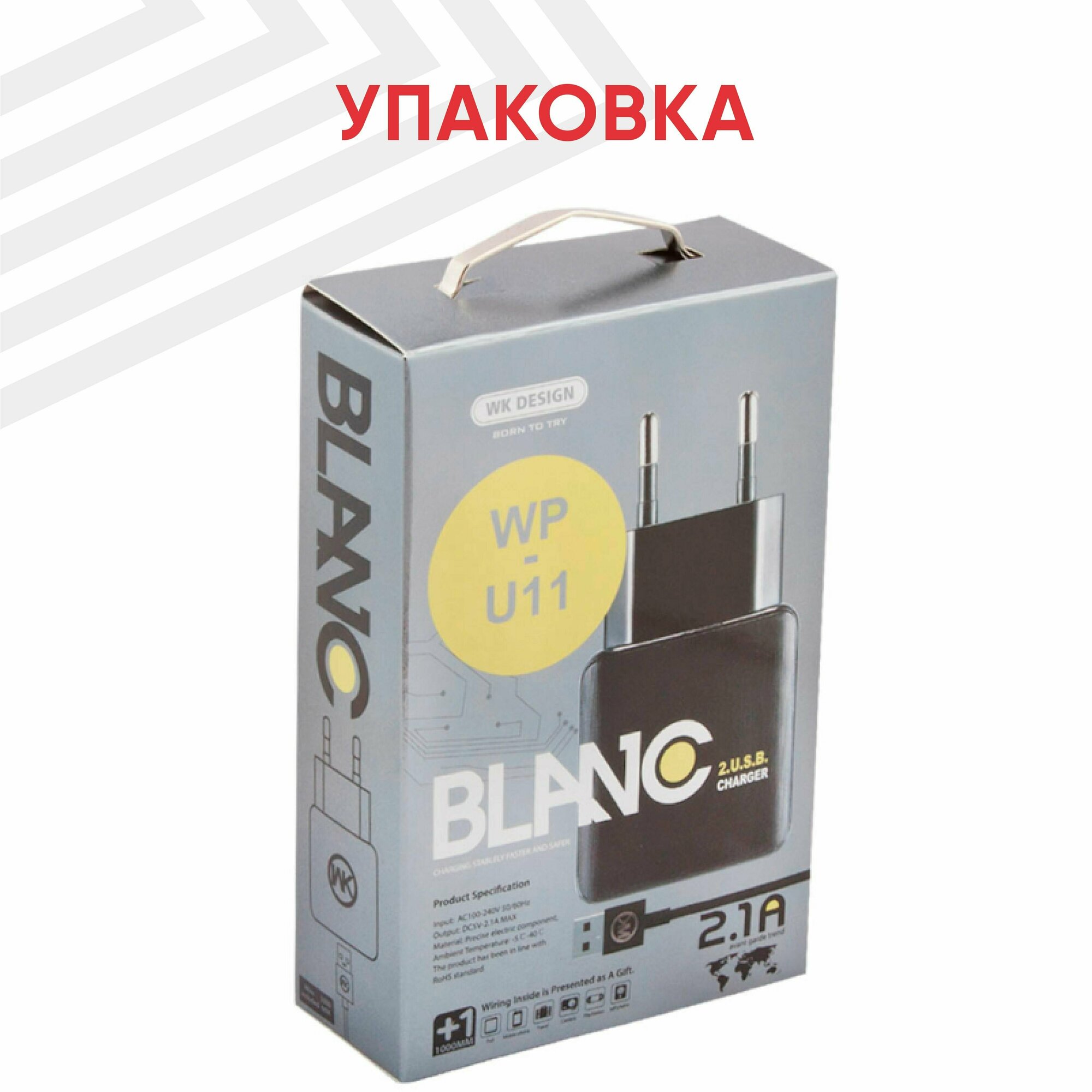 Сетевое зарядное устройство (адаптер) WK Blanc 2U WP-U11, 2 порта USB-А, 2.1А, кабель MicroUSB в комплекте, 1м, черный